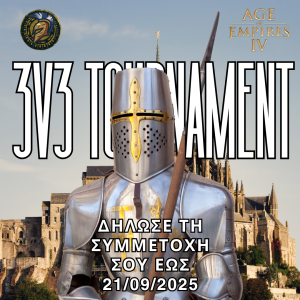 Σας περιμένουμε στο 3v3 tournament για το Age Of Empires IV που θα τρέξει λίγο πριν την κυκλοφορία του νέου DLC του παιχνιδιού. Δηλώστε συμμετοχή